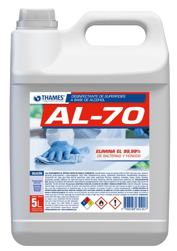 Desinfectante de superficies a base de alcohol etílico al 70%. Producto listo para usar. Aprobado por ANMAT y SENASA.